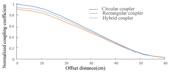 The results of the qualitative analysis show that the equal surrounded area result is in the middle of the other two results, so it is a key point of comparison for circular and square coils. Clear results can be obtained by analyzing circular and square coils of equal enveloping area. Figure 12 shows the simulation of normalized coupling coefficients for the same enveloping area of circular, hybrid, and square couplers of the three coupler types. The horizontal axis is the horizontal distance between the center of the transmitting coil and the center of the receiving coil. The size of the square loop is 0.3 m × 0.3 m in length and width, and the radius of the circular loop is 0.17 m. The height of the two coupling coils in the simulation is fixed at 0.3 m. The simulation results show that the coupling coefficient is highest for the circular coupler and lowest for the square coupler, i.e., the coupling coefficient of the circular coupler is higher than that of the square coupler. These results are consistent with the qualitative analysis above.