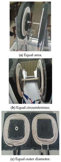 In the case of the same outer diameter, as shown in Figure 11c, all of the area and circumference ratio is /4. The magnetic flux of the circular receiving coil is smaller than that of the square receiving coil because the surrounded area of the circular receiving coil is smaller than that of the square receiving coil.