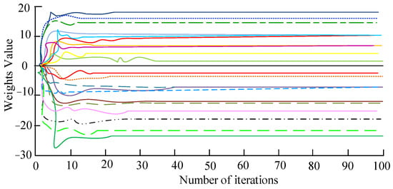 The figure showcases that the predicted output value (POV) changes with time. The POV and the actual output value curves can fit well. Both the predicted and actual output values show fluctuations across a wide range with time, and the fluctuation value range takes the value of [0.4, 1.38]. Setting the nodes’ quantity in the implied layer to 50, the useful weight output obtained under the same time series system is shown in Figure 5.