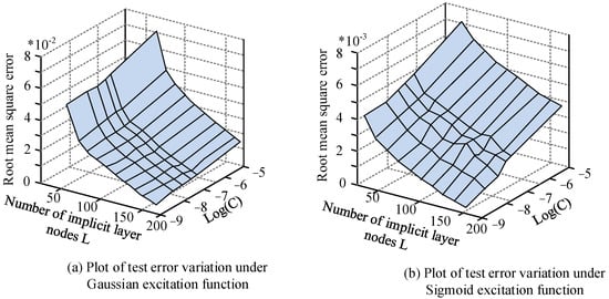 Figure 3 showcases the algorithm, which first needs to input the quantity of nodes in the hidden layer (HL), set by initializing the parameter, and cycle through the corresponding values. Set the regularization parameters of the model to 10−9, wherein the number of hidden nodes L is set to 50; The value of iteration number k is 1000; F(t) is the new hidden layer output of input data under the number of t; and Q(t) is the Convex function solution function under the Identity matrix I. The functional expressions for F(t) and Q(t) are given in Equation (21).