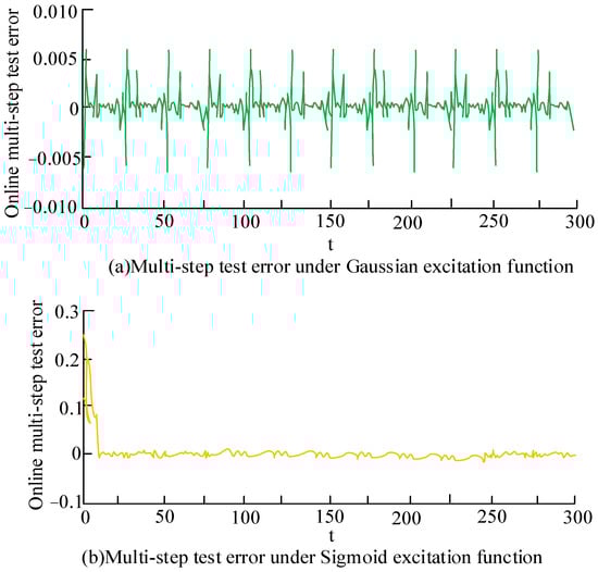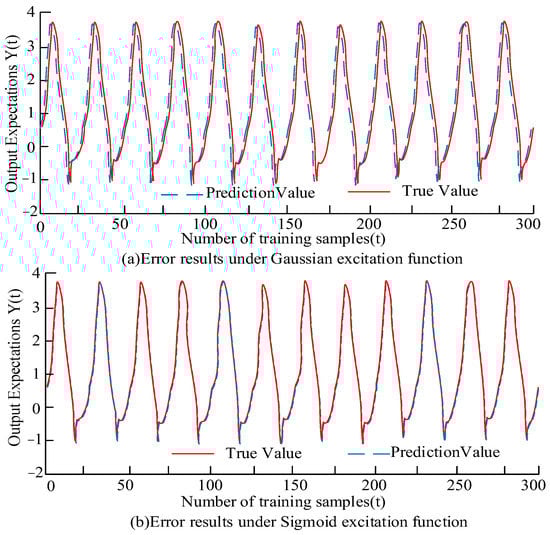 From Figure 7a, under the Gaussian excitation function, the output expected value curves of the predicted results and the true values show a consistent trend, and there is a good fitting effect between the two predicted curves. In Figure 7b, the predicted result curve obtained from the s-type excitation function is completely consistent with the true value prediction curve.