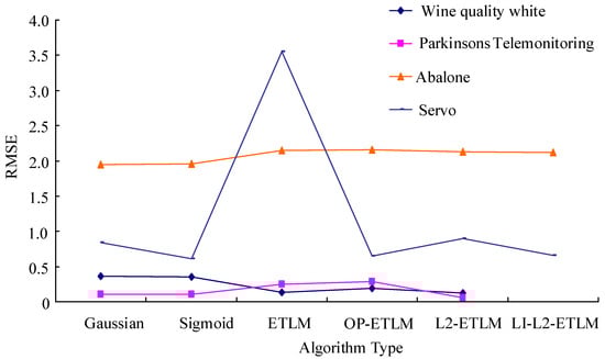 Figure 9 indicates the L2-ETLM algorithm performs best in the Wine Quality White and Parkinson’s Telemonitoring datasets, with RMSEs of 0.1241 and 0.0564, respectively. The ADMM-LI-ETLM algorithm performs best in the Abalone and Servo datasets. The difference in the square root of ADMM-LI-ETLM under different excitation functions is small, ranging from 0.00669 to 0.225. There is no difference in the order of magnitude, indicating that the prediction values of ADMM-LI-ETLM with different excitation functions are less different and the performance is stable.