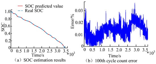 After testing the presented algorithm and the online evaluation model, the next step is the practical testing of the model applied to lithium batteries. The study uses a Sony VCT4 model 18650 battery as the experimental object. The algorithm is verified for the real-case Li-ion battery SOC prediction. The prediction results with errors at the 100th cycle are scaled up, and the outcomes are demonstrated in Figure 10.