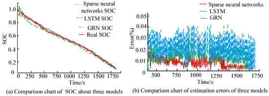 Figure 10a showcases that the SOC prediction reduces as the cycle’s quantity increases, which is in line with reality. The curves of the actual SOC value and the forecasting SOC value fit well, and the curve of the predicted SOC value will be a little below the real SOC value at some moments. It can be considered that it is possible to make an accurate prediction of the SOC state of the Li-ion battery in the real situation and at the same time play a certain protective role. The error results for the 100th cycle are showcased in Figure 10b, which shows that the error value fluctuates with time from 0 to 0.037. The average error (AE) in the 100th cycle is 0.67%, indicating that the SOC evaluation model proposed in the study is good. For validating the model, the Sony VCT4 18650 battery was also used as the experimental object. Compared with the commonly used battery SOC prediction models with good performance, like the Long Short-Term Memory (LSTM) and Gated Recurrent Neural (GRN), the outcomes are demonstrated in Figure 11.
