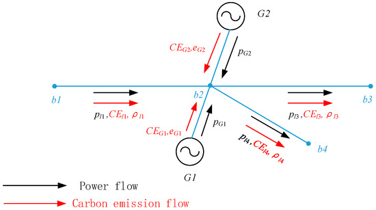 In the electricity market, power generators are considered as direct sources of carbon dioxide emissions, but the demand side is the fundamental driving factor for carbon emissions. The thread diagram of carbon emission flow is shown in Figure 1. Carbon flow is a ‘virtual flow’ that exists based on the power flow, accompanying the power flow through each node, branch, and load in the power system. The proposal of carbon emission flow theory (the Smart Energy Laboratory of the Collage of Electrical Engineering at Tsinghua University in 2012, Beijing, China) can effectively allocate the carbon emissions injected into generators to various nodes, branches, and loads in a fair and reasonable manner, and clarify the carbon emission responsibilities of the consumer side. In order to track carbon emissions from the generation side to the consumption side, a carbon emission flow (CEF) model based on the proportional sharing principle (PSP) has been proposed in [21]. It should be noted that the PSP is a fundamental assumption of the CEF model, which can linearize the relationship between power flow and accompanying virtual emission flow.