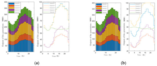 (a) Generator output in scenario 1; (b) generator output in scenario 2.