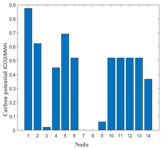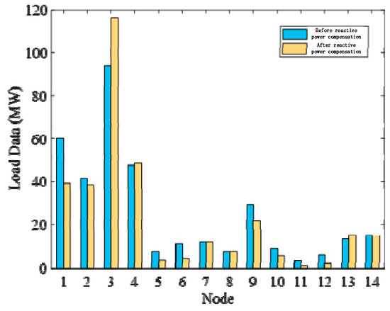 The node carbon potentials of the 14-bus system in Scenario 2 are shown in Figure 4, and node load data before and after reactive power compensation are shown in Figure 5.