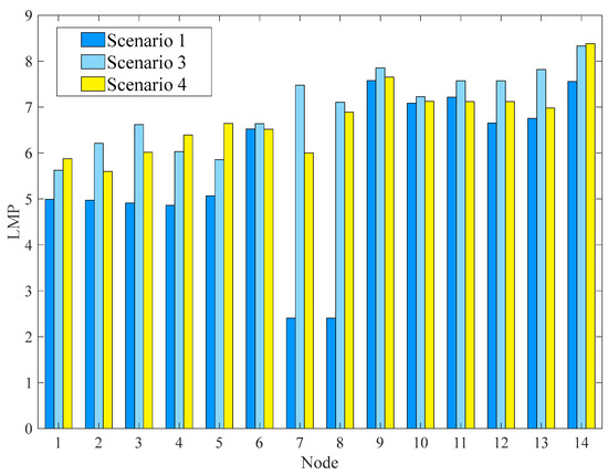The LMP of nodes in three scenarios is shown in Figure 6.