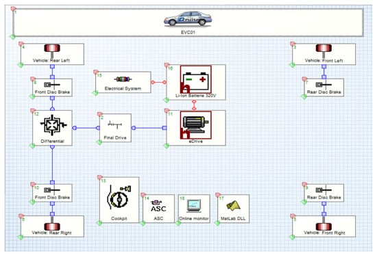 AVL CRUISE software is favored by researchers in the automotive industry because of its advantages of simple graphical modeling conditions and is a quick and convenient simulation tool for vehicle development requirements [,]. The vehicle model adopts rear−wheel drive. According to the power system structure of the vehicle, the vehicle module, drive motor module, battery module, main reducer module, differential module, tire module, and brake module are successively added to work areas of CRUISE software. After the module is added, correct mechanical connection, electrical connection, signal connection between components, and energy transfer are carried out. It is shown in Figure 2.