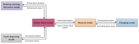 In this paper, the operation mode of mini−electric trucks is set into five modes: neutral mode, motor drive mode, charging mode, fault disposing mode, and braking energy recovery mode. As the software control part of the vehicle controller, the vehicle control strategy can define the current vehicle operation mode and convert the control modes to each other according to the current vehicle operation mode signal and the different signals received [,]. The specific transformation relationship between modes is shown in Figure 3.