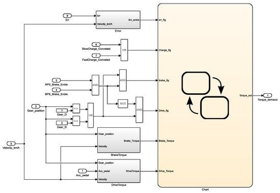 The vehicle mode conversion control strategy model is built in order to analyze the operating mode of the vehicle under various conditions []. The mode conversion trigger condition chart is removed and each major function model is built separately, so a motor torque control model can be built, it is shown in Figure 6.