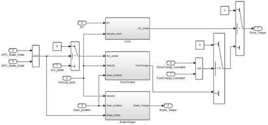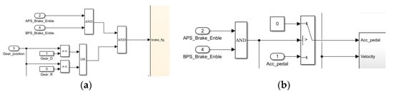 The realization of this function in the torque−required calculation model is shown in Figure 7b. The input signals of ‘APS_Brake_Enble’ and ‘BPS_Brake_Enble’ still pass through the logic operation module ‘AND’ at the same time, when the signal is ‘1’ at the same time, the output is ‘1’. At this moment, it passes through the Switch module, and the passing condition of the Switch module is set as more than ‘0’. When the output of the previous logic operation module ‘AND’ is ‘1’, since ‘1’ is more than ‘0’, the constant ‘0’ passes, and the signal of the ‘Acc_pedal’ is ‘0’, the accelerator pedal sensor fails. On the contrary, when the signal of ‘APS_Brake_Enble’ is ‘1’, the signal of ‘BPS_Brake_Enble’ is ‘0’, the output of the logical operation module ‘AND’ is ‘0’; ‘0’ does not meet the condition of more than ‘0’, and the signal of ‘Acc_pedal’ passes so that the vehicle can run normally. When the signal of ‘APS_Brake_Enble’ is ‘0’ and the signal of ‘BPS_Brake_Enble’ is ‘1’, the signal of ‘Acc_pedal’ also passes, but because the signal of ‘APS_Brake_Enble’ is ‘0’, the signal of ‘Acc_pedal’ must be ‘0’, which is equivalent to constant ‘0’.