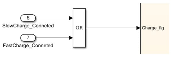 The module prohibiting vehicle driving on charging is separated from the whole vehicle operation mode, it is shown in Figure 8. Because there are only two modes of fast charging and slow charging when a pure electric vehicle is charged, the slow charging signal ‘SlowCharge_Conneted’ and fast charging signal ‘FastCharge_Conneted’ pass through the logic operation module ‘OR’. If at least one input signal of ‘SlowCharge_Conneted’ and ‘FastCharge_Conneted’ is ‘1’, the output is ‘1’, the signal of ‘Charge_flg’ is ‘1’, and the vehicle enters charge mode. Similarly, the part of prohibited vehicle driving on charging in the torque required calculation model is similar to this part of the model.