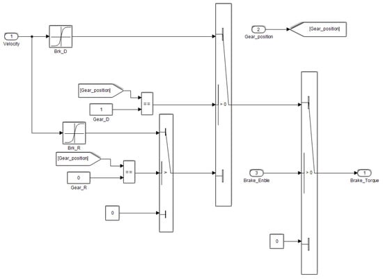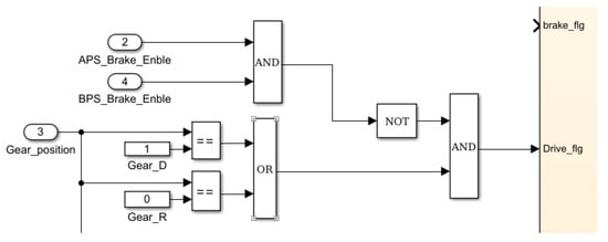 The brake priority model is isolated from Figure 3 separately; it is shown in Figure 7. In Figure 7a, the part of the model realizes the braking priority processing function required by the vehicle control strategy. When the input signals of ‘APS_Brake_Enble’ and ‘BPS_Brake_Enble’ pass through the logic operation module ‘AND’ at the same time, if both input signals are ‘1’ at the same time, ‘1’ will be output. Because there is only a ‘Drive gear’ signal and a ‘Reverse gear’ signal in ‘Gear_position’ signals, and they pass through the logic operation module ‘OR’, one of the input signals is ‘1’, and the output is ‘1’. Because there are only two ‘Gear_position’ signals, the output must be ‘1’. After that, the output of the two logic operation modules ‘AND’ and ‘OR’ are all ‘1’. After passing the logic operation module ‘AND’ again, the output signal is ‘1’, then the ‘brake_FLG’ signal is ‘1’ and the brake mode is entered.