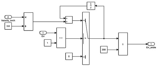 The fault handling model is shown in Figure 10. There are two signal inputs in the model, namely the speed signal ‘Velocity_km/h’ and fault detection signal ‘Err’. In the model, the signal of ‘Err’ controls the Switch module. When a fault is detected, it is judged by the relational operation module and the output is ‘1’, which meets the judgment conditions of the Switch module. Then it passes through the above fault integral, whereas the constant ‘0’ passes, and there is no fault or the fault disappears. After meeting the failure conditions. The input signal is ‘Velocity_km/h’ because its unit is km/h; the unit is converted into meters per second after passing the first operation module, and then the Unit Delay module is used to delay the signal for one sampling cycle and accumulate by the operation module in order to achieve the purpose of integration, when the integral value accumulated reaches 200, after meeting the following relational operational logic, ‘Err_enble’ signal is output.