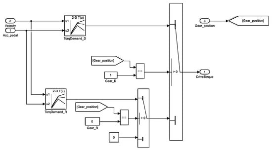 The driving control model of the vehicle control strategy is shown in Figure 11. The model reflected the function of the motor’s output torque by analyzing the current speed signal and pedal signal. There are three signal inputs in the model: acceleration pedal degree signal ‘Acc_pedal’, velocity signal ‘Velocity_km/h’, and gear signal ‘Gear_position’. The output end is the motor torque. The gear signal of the vehicle is determined by the three input signals, and the gear signal controls the two Switch modules respectively to realize the motor torque calculation of the forward gear and reverse gear. The specific value of torque corresponding to the speed is obtained by looking up a two-dimensional Table.