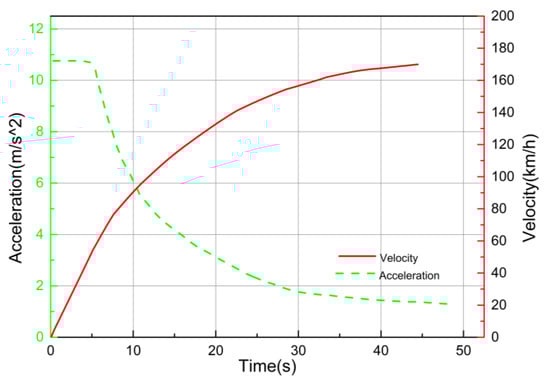 The acceleration time curve is shown in Figure 14, acceleration performance of the vehicle can be comprehensively analyzed from Figure 14. It can be seen that the acceleration time from 0 to 50 km/h and from 0 to 100 km/h is 4.7 s and 11.59 s, respectively. The acceleration time from 0 to 50 km/h is less than 6 s and the acceleration time from 0 to 100 km/h is less than 14 s, which meets design requirements.