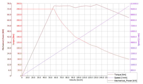 After completing the task settings, the simulation can be executed in the CRUISE Computing Center. The simulation results of the maximum climbable gradient are shown in Figure 13, the simulation results of acceleration performance are shown in Figure 14, and the simulation results of the drive motor are shown in Figure 15. The ideal mechanical characteristic curve of the drive motor is shown in Figure 16.