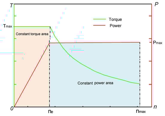 The speed of mini−electric trucks is proportional to the speed of the drive motor. The faster the speed of the motor is, the higher the speed of the vehicle. Therefore, the horizontal coordinate can be used as the speed of the motor when observing or analyzing the curve changes of torque and power in Figure 15. From Figure 15, it can be seen that the curve changes of torque and power are similar to the ideal mechanical characteristic curve. The ideal mechanical characteristic curve of the drive motor is shown in Figure 16. It also verifies that the performance of the drive motor in the simulation model is close to that of the ideal drive motor, so the setting and selection of the motor are reasonable.