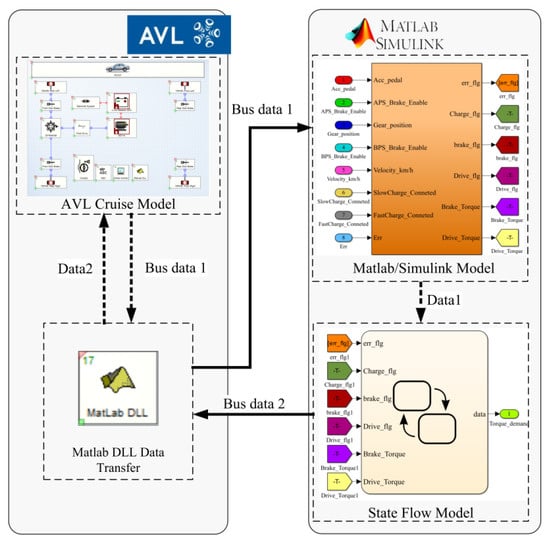 Simulink is a simulation modeling tool in MATLAB that can convert data into graphics or images to be displayed and provides an integrated environment for dynamic system modeling, simulation, and comprehensive analysis []. Therefore, according to the above functional requirements of the vehicle, Simulink in MATLAB is used to build the vehicle control strategy model.