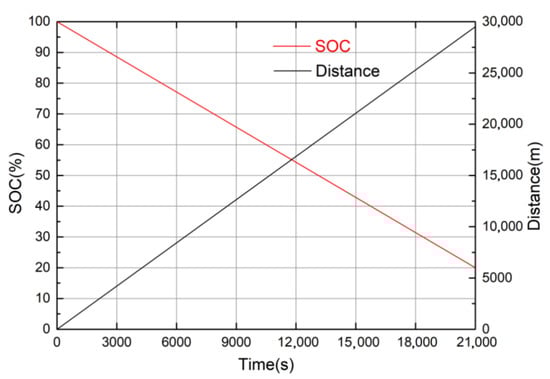 From Figure 18, it can be seen that the endurance mileage is 295 Km under UDC conditions, it is higher than the expected performance index by 5%, which satisfies the design requirements.