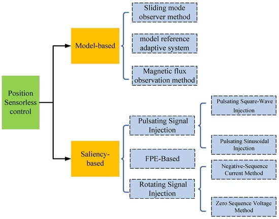 The current sensorless control technologies of PMSM are mainly divided into two categories, namely, model-based methods and salience-based methods. The former are mainly used in the high-speed range of the motor, while the latter are mainly used in the zero-speed and low-speed ranges. This section presents the latest research results regarding these two methods in detail.
