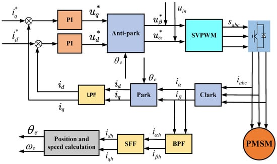 Figure 2 shows the structure of a typical PMSM drive system, which mainly includes the current loop and hardware facilities. The hardware facilities include inverter, permanent magnet synchronous motor, power supply and various sensors, while the current loop is composed of two PI controllers. The operation of the permanent magnet synchronous motor requires an accurate position of the rotor and usually requires position sensors (such as photoelectric encoders and Hall sensors) to obtain accurate information on the rotor’s position, and then accurately control the motion state of the motor. The position-sensorless method can eliminate the position sensor, estimate the rotor’s position and speed through a specific algorithm, and enhance the stability of the system.