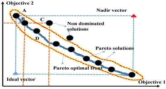 If no other design exists that may increase the value of any one of a design’s objective criteria without degrading at least one other criterion, the design is said to be Pareto optimum. This resulted in an optimization problem formulation without objective function aggregation and normalization. A point k* in the feasible design space ‘S’ is Pareto optimal if, and only if, another point ‘k’ in the set ‘S’ does not exist, such that Y(k) ≤ Y(k*) with at least one Y1(k) > Y1(k*). Unless otherwise indicated, the term “Pareto optimum” is considered to refer to the complete decision of variable space. The inequalities between vectors components applied to each attribute are represented as Y(k) ≤ Y(k*), which implies Y1 ≤ Y1*, Y2 ≤ Y2*, and so on. The Pareto-optimum set, which can refer to points in the design space or points in the criteria space, is the collection of all Pareto-optimal points. According to the criteria above, there must be no other point in the feasible design space ‘S’ that improves at least one objective function while leaving others intact for ‘k*’ to be referred to be the Pareto-optimum point. In Figure 2, the idea of Pareto optimality is shown; it is using multi-objective optimization techniques for an optimal solution on the Pareto front. The ideal solution covers multiple objective optimizations with non-dominated solutions on the Pareto-optimal front.