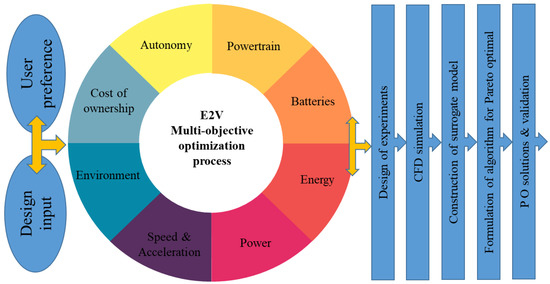 Pareto optimality is regularly implemented in various electric vehicle design applications ranging from vehicle suspension [29,30], braking systems [31], permanent magnet motors [32], control system design, cell design [33], etc. The components of the objectives are not combined into a single fitness function; instead, they are kept distinct at all times during the optimization process. They can resolve all competing design requirements independently and concurrently. The solutions on a Pareto front consequently have the optimal objective functions, given their constraints, and are not dominated by any other locations in the design space. The system block diagram of electric two- and three-wheelers with a multi-objective optimization process is shown in Figure 3. It covers autonomy, the powertrain, batteries, the management system, environmental conditions, and power.