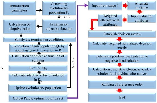 Two-stage flowchart of a technique for order preference by similarity to ideal solution analysis for an electric two-wheeler to rank preference order of different attributes.