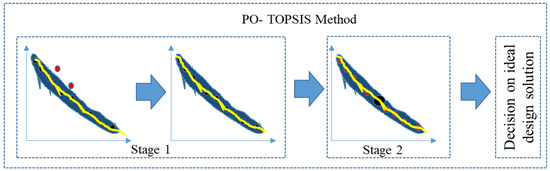 Two-stage characteristic features of TOPSIS analysis with the decision on ideal design solution from a positive ideal solution to a negative ideal solution. PO-TOPIS: Pareto-optimality technique for order preference by similarity to an ideal solution.