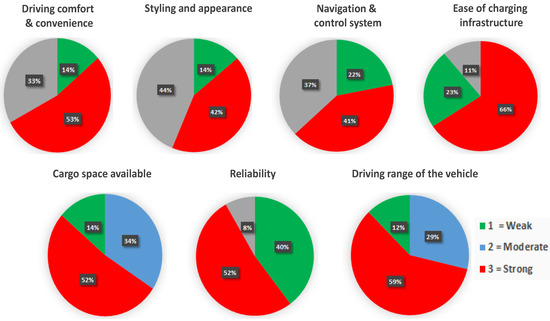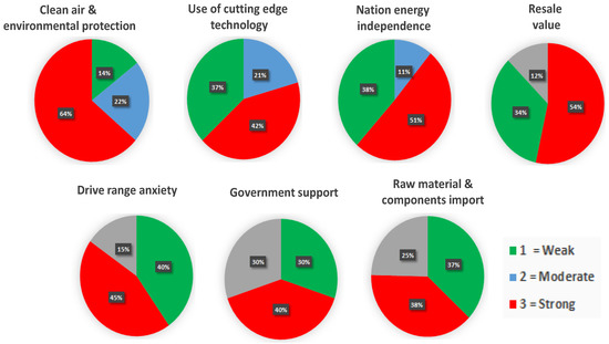 Figure 9 illustrates the survey results regarding E2Ws on clean air and environmental protection, innovative technology, national energy independence, resale value, driving range anxiety, government support, and raw material and component export. A rating of 1 = weakly agree, 2 = moderately agree, and 3 = strongly agree.