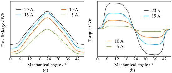 Electromagnetic characteristic curve of a 12/8 SRM: (a) flux linkage curve; (b) torque curve.