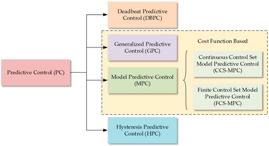 In predictive control, the best input sequence, u(k), is determined by forecasting future states using a stable, discrete-time model. The objective is to guide the state x toward the reference Γ* using the ideal input sequence u(k) for each sample interval. This optimal solution is derived by addressing the constrained finite-horizon control challenge using a cost function or a designated predictive model. The chosen u(k) is then deployed in the succeeding sampling interval, k + 1. Under this approach, the chosen input u(k) can be employed regardless of whether or not a modulator is present, affecting the closed-loop controller’s efficiency and switching frequency traits. In this review, PC techniques of SRMs are categorized according to the standard shown in Figure 4 [79]. Table 1 provides a detailed introduction to the characteristics of each prediction method.