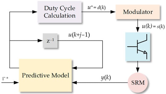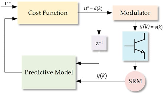 DPC addresses the constrained finite-horizon optimization control challenge by directly determining the optimal input sequence using the predictive model [67]. Utilizing machine parameters, the current state x(k), and the previously computed best input sequence u(k), the upcoming input sequence u(k + j) is forecasted by the predictive model, which brings the error to nil. Figure 7 shows the basic block diagram of this procedure. The intent is to accomplish a zero error in the forthcoming sampling period, which results in y(k +1) equating to Γ*. Thus, the model’s representation can be described as
