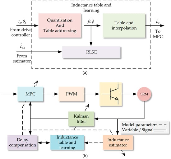 Another approach is the online estimation and learning of the inductance surface [93], used a stochastic MPC scheme for switched reluctance motor current control. The comprehensive layout of the suggested inductance table and its learning mechanism can be seen in Figure 9a, while Figure 9b illustrates the complete control structure. The system incorporates a state estimator, crafted as a recursive linear quadratic regulator. Furthermore, a dynamic learning system is designed to adapt the motor’s inductance curve in real-time, updating both the MPC and the Kalman filter parameters accordingly. This advanced control approach is adept at managing uncertainties and disturbances found in the machine’s nonlinear inductance landscape.