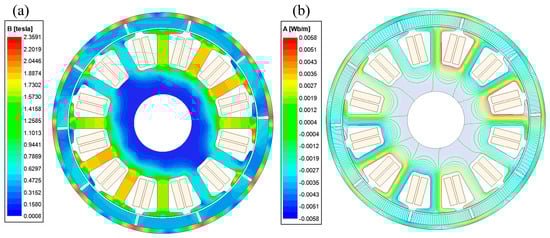 Based on the above motor structure and parameters, no-load simulations of the motor were carried out on the ANSYS Maxwell platform to verify the validity of the design. Figure 2a,b depicts the magnetic flux density and magnetic lines of force of the motor when it is rotating at an angle of 55° under no-load conditions. Observations reveal that only the stator tooth tip is saturated, and the saturated area is periodically symmetric, which has little impact on the operation of the motor. Moreover, the magnetic density of the stator yoke is not saturated and is not susceptible to demagnetization. Furthermore, the magnetic lines of force are symmetrically distributed, allowing the majority of them to enter the stator without obstruction. In other words, there is almost no magnetic flux leakage, and the distribution of magnetic lines of force is relatively optimal. Thus, it can be concluded that the magnetic flux density and magnetic lines of force of the stator in the no-load condition satisfy the design requirements.