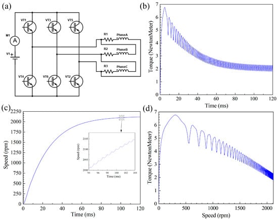 Following the no-load simulation, the motor was simulated again to characterize its performance under load. The objective was to determine if the design is capable of achieving the expected working performance at a rated supply voltage of 12 V. The control circuit diagram is shown in Figure 4a; the time step of the simulation is 0.0002 s. First, the start-up process of the motor was simulated with a constant output power of 415 W when the mechanical characteristics are considered. Figure 4b depicts the electromagnetic torque waveform of the process from the start-up state to the steady working state of the motor. A constant value of the electromagnetic torque is observed at approximately 2.14 N·m, suggesting that the output torque can satisfy the actual work requirements. Figure 4c illustrates the revolution speed of the motor during its start-up and steady operation states. The speed rises rapidly at first and stabilizes at around 2200 rpm when reaching the steady state, which also satisfies the requirements. Figure 4d shows the torque-speed curve of the motor during start-up.