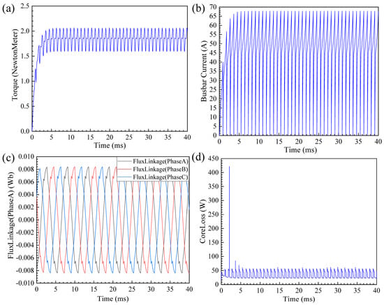 (a) The calculated electromagnetic torque waveform, (b) the Busbar current waveform, (c) the three-phase flux linkage diagram of the proposed PMBLDC motor, and (d) the iron loss waveform.