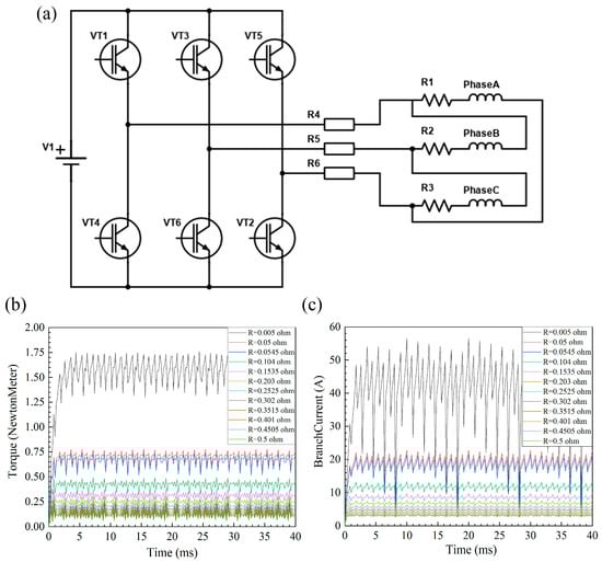 After the control circuit is added to the brushless DC motor, the resistance value of the resistance R4 R5 R6 was set to the same parameter, and this parameter was scanned after setting the initial value, final value, and step size. The time step of the simulation was 0.0002 s. Since the power supply voltage remains unchanged, each resistance value corresponds to a current value. This method can be used to simulate multiple different input current values when the motor is running at the rated speed. As depicted in Figure 6b,c, the output electromagnetic torque and output line current vary with resistance. In conjunction with the simulation results obtained when the resistor was disconnected from the control circuit, the maximum electromagnetic torque of the proposed PMBLDC motor can be calculated as 1.80 N·m at an input line current of 49.13 A. This method provides a reference for other applications requiring a change in output torque at a constant speed; by varying the resistance of the control circuit to regulate the input current under a fixed supply voltage, the output electromagnetic torque of the motor can be controlled indirectly.