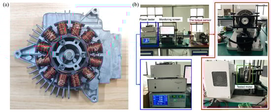 In order to further explore the actual output characteristics of the proposed PMBLDC motor, a prototype was developed and a bench test was performed. The prototype is shown in Figure 7a. The test platform consists of a power tester, tooling, a torque sensor, and a monitoring screen. The motor prototype was connected to the torque sensor through the tooling, and a power tester was used to measure the motor power and current during the entire test process. All test data were displayed on the monitor screen in real time, as shown in Figure 7b. The torque sensor, power tester, and the software we used are all from SUGAWARA company, using non-inductive FOC to control them. During the experiment, the motor was kept running at a speed of 2200 rpm and the external load of the motor was gradually increased to investigate the changes in the current and output power of the motor from normal operation to hindered operation.