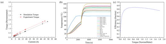 (a) Simulated and experimental current-torque curves, (b) temperature change diagram, and (c) efficiency waveform.