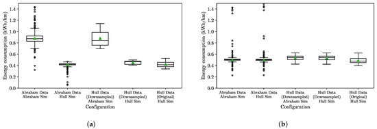 Regarding the two waypoint inconsistencies: Inconsistency 2a caused the vehicle to decelerate and accelerate unnecessarily at each waypoint, rather than simply passing them by. Giliomee et al. [17] point out that this would lead to a higher energy consumption and estimate a theoretical compensation factor of −24% to compensate for the error. Since inconsistency 2b mostly affected the total distance that the simulated vehicle travelled, it only affected the total energy consumption, while this study concerns itself with energy consumption per unit distance.