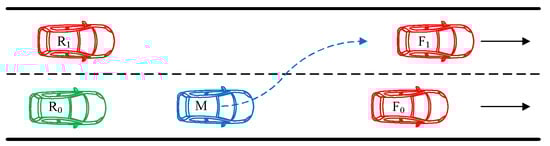 Under structured road conditions, a vehicle lane-change environment model diagram is shown in Figure 1. In the figure, the self-driving vehicle is represented as vehicle M, the vehicles in front and behind the original lane are represented as F0 and R0, respectively, and the vehicles in front and behind the target lane are represented as F1 and R1, respectively.