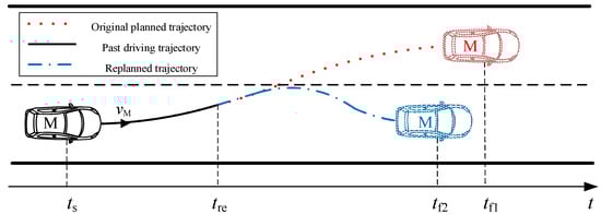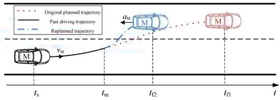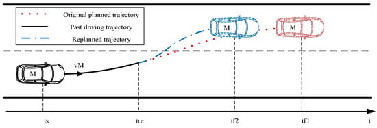 In order to avoid collision, lane-change replanning is carried out. According to the lane-change replanning selection strategy, 0.5 s after the start of the lane change, the car in front of the original lane starts to decelerate with a deceleration velocity of −3 m/s2. At this time, the original lane still meets the safety conditions for a lane change, so no replanning is needed. One second after the start of the lane change, the car in front of the original lane increases its braking intensity and brakes with a deceleration velocity of −5 m/s2; at this time, the original lane does not meet the safety conditions for a lane change, the target lane meets the safety conditions for a lane change, and the lane-change trajectory is corrected. The simulation results of the lane-change trajectory correction conditions are shown in Figure 11.