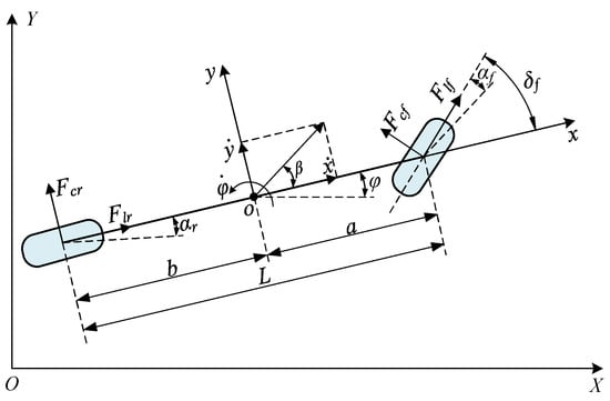 In Figure 6, XOY is the geodetic coordinate system, oxy is the body coordinate system, and o is the vehicle’s center of mass. The names of vehicle-related parameters are shown in Table 1. Based on the vehicle three-degrees-of-freedom dynamics model, a nonlinear three-degrees-of-freedom vehicle dynamics model can be obtained, as shown in Equation (25).