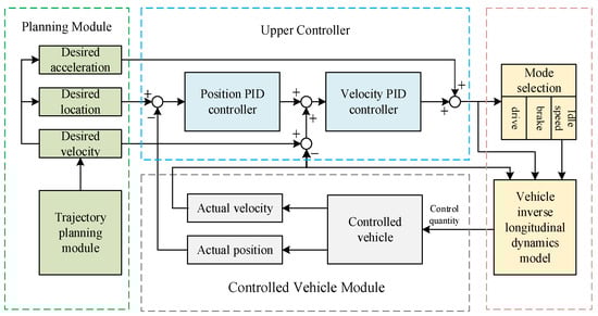 The longitudinal control adopts a hierarchical design, and the upper controller adopts double PID control to calculate the desired acceleration based on the difference between the current position and velocity and the reference position and velocity, and outputs it to the lower controller. The lower controller selects the drive or brake mode or maintains the idle state according to the desired acceleration, calculates the relevant control values through the vehicle inverse dynamics model, and inputs them to the controlled vehicle to complete the vehicle longitudinal velocity control. The vehicle longitudinal controller is shown in Figure 7.
