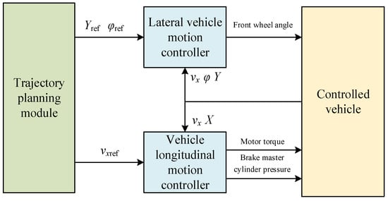 Since the lateral motion of the vehicle has less influence on the longitudinal motion control, the variation of the longitudinal vehicle velocity has more influence on the lateral motion control of the vehicle. Therefore, the actual longitudinal vehicle velocity is input to the lateral motion control system as a state value, the time-varying longitudinal vehicle velocity parameters are considered, and the vehicle prediction model is continuously updated by using the characteristics of MPC feedback correction. The integrated lateral and longitudinal controller of the whole vehicle is shown in Figure 8. In order to ensure the stability of the integrated lateral–longitudinal control, the constraints of lateral acceleration and trajectory curvature on the vehicle longitudinal velocity and the friction circle constraints related to the road surface adhesion coefficient and vehicle vertical load need to be added, as shown in Equations (31) and (32), respectively.