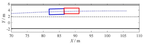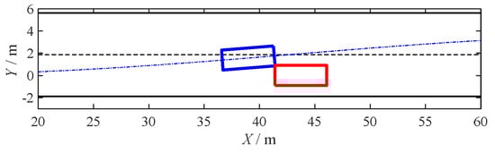 Using the vehicle center-of-mass position and heading angle information, the coordinates of the four corner points of the vehicle are calculated. At the moment tc1 = 1.82 s when the vehicle completely crosses the collision risk auxiliary line Line1, which overlaps with the left side of the vehicle in front of the original lane after the lane change trajectory correction, the position relationship between this vehicle and the vehicle in front of the original lane at this time is shown in Figure 12.