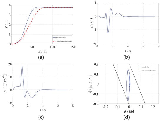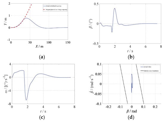 As can be seen from Figure 11a, within 1 s from the start of the lane change, the vehicle tracks the original planned trajectory. When the lane change process is at 1 s, trigger the lane-change replanning and correct the lane-change trajectory. It can be seen from Figure 11b,c that in the process of lane-change replanning, in order to avoid rear-end collision with the vehicle in front and emergency braking, emergency obstacle avoidance must be carried out through rapid steering, resulting in certain fluctuations in the declination angle and yaw angle speed of the center of mass of the vehicle. The phase plane is widely used as the vehicle driving stability criterion for vehicle stability judgment []. The two black dashed lines in Figure 11d represent the boundary of the phase plane stabilization zone. And it can be seen that the driving state is always located in the phase plane stability zone during lane-change replanning.